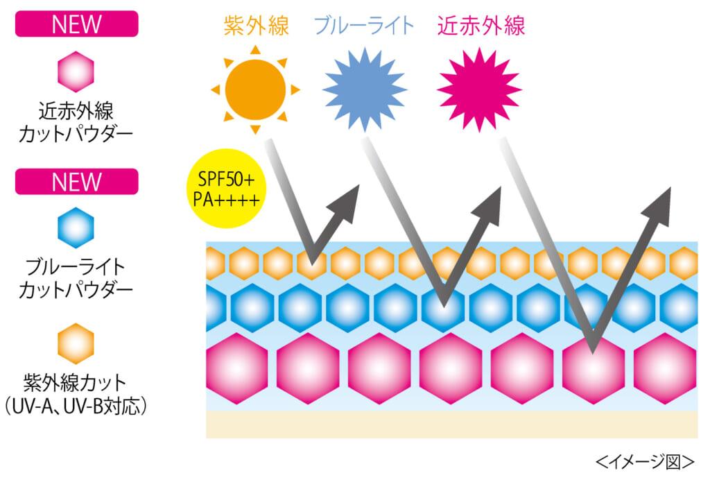 SPF50+・PA++++/UV耐水性★★の最強UVカット※11に加え、太陽光に含まれるブルーライトや近赤外線をカットするパウダーを新配合しました。