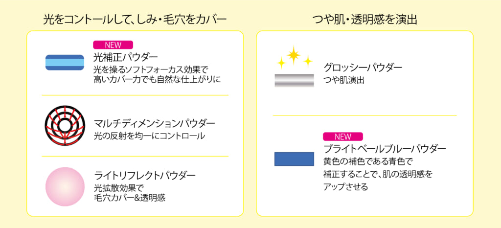 さらに、しみのカバー力を底上げする機能性パウダーに、しみ・毛穴をカバーする「光補正パウダー」と、つや肌・透明感を演出する「ブライトベールブルーパウダー」を追加配合。