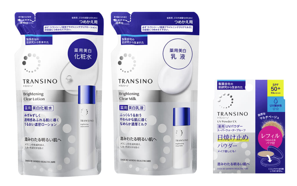 左:トランシーノ®薬用ブライトニングクリアローション[医薬部外品] 販売名:DSローションb つめかえ用150mL 税込価格:3,080円<編集部調べ> 中:トランシーノ®薬用ブライトニングクリアミルク[医薬部外品] 販売名:DSミルクb つめかえ用90mL 税込価格:3,080円<編集部調べ> 右:トランシーノ®薬用UVパウダーEX[医薬部外品] 販売名:DSUVパウダーb レフィル11g 税込価格:2,970円<編集部調べ>