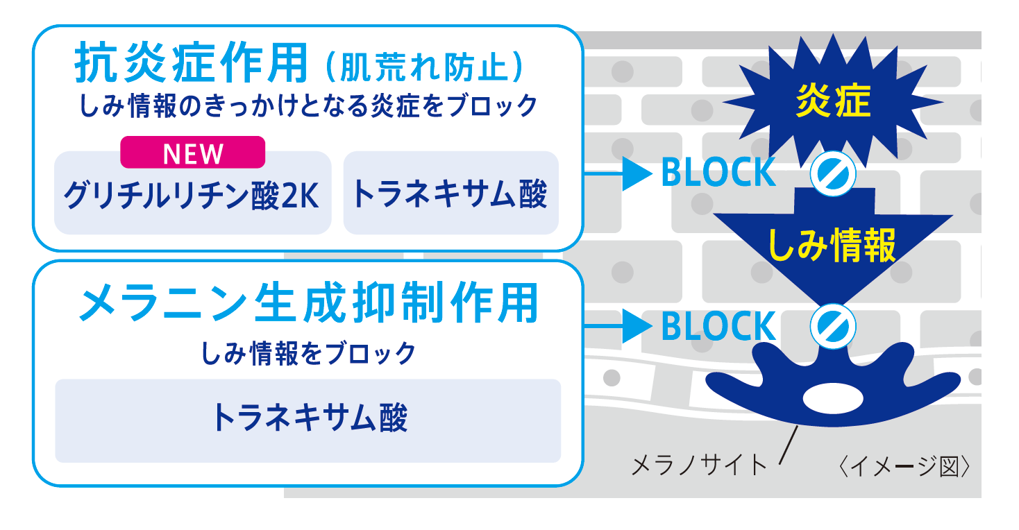 ベーシックケアとなる化粧水と乳液には、美白※3・抗炎症の作用を持つ有効成分トラネキサム酸に加え、肌荒れ防止有効成分「グリチルリチン酸2K」を追加配合。