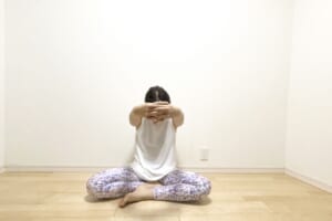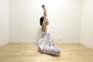 (1)あぐらの状態で床に座ったら指を組み、手のひらを返して息を吸いながら腕を上げます。