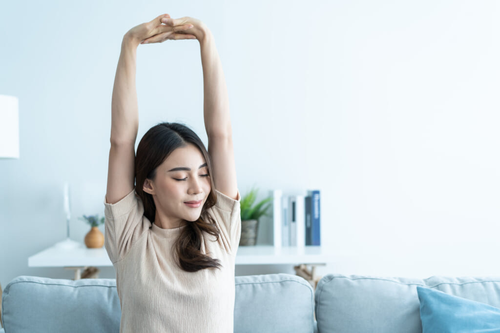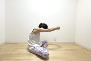 腕を前に伸ばす際に、腹筋を縮めるイメージで上半身を曲げると、ぜん動運動にアプローチできます。