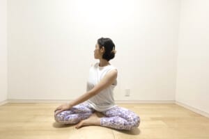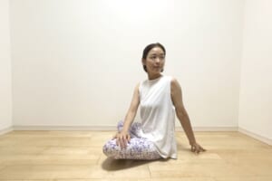 (7)心地いいところまで上半身を捻ったら、その場で3呼吸ポーズをキープします。