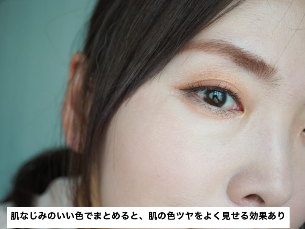 筆者は暖色系のカラーがなじみやすいので、目元と頬をコーラルやオレンジ系のカラーでメイクしました。