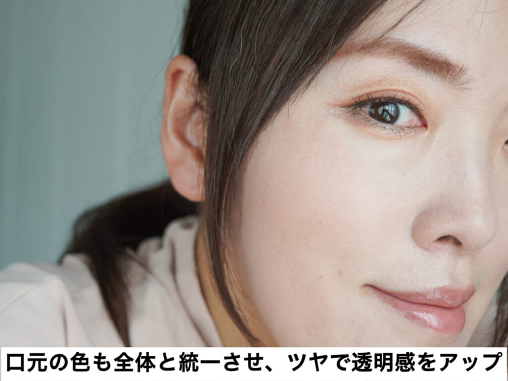 今回は、リップの色はコーラルベージュにし、ツヤ感をしっかり出せるタイプをチョイスしました。全体を同系色でまとめることで、自然かつ上品に透明感を高められるでしょう。