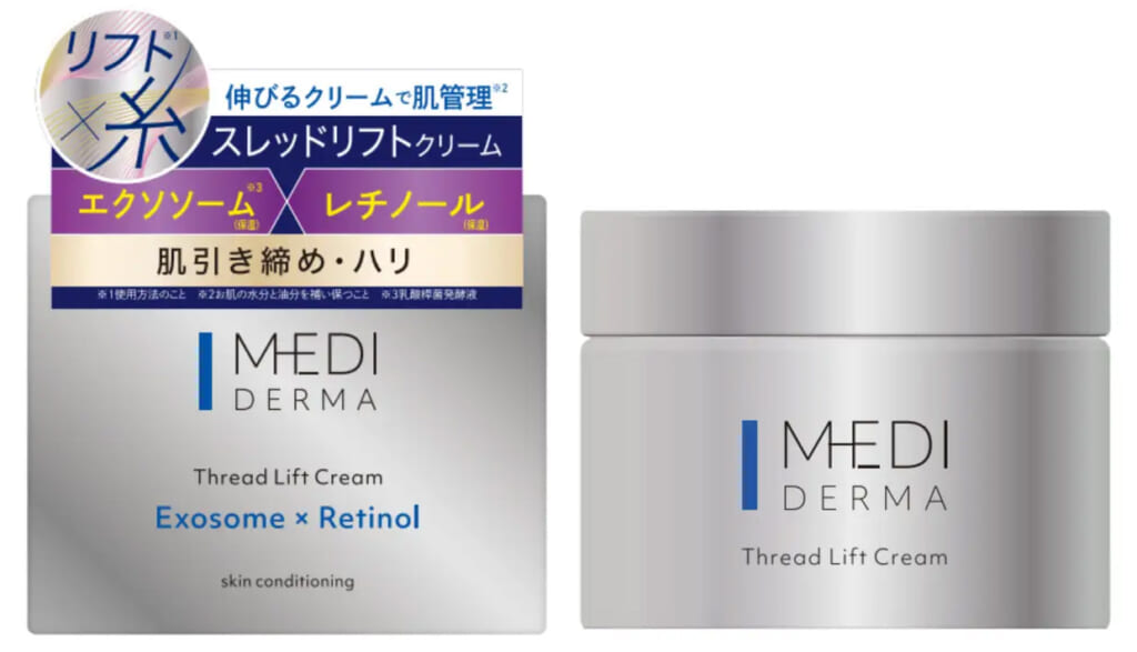「メディダーマ スレッドリフトクリーム」には、乳酸桿菌由来「エクソソーム※2」「レチノール※3」「スレッドヴェールEX」を配合。