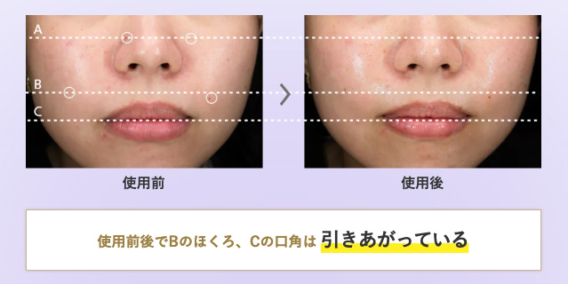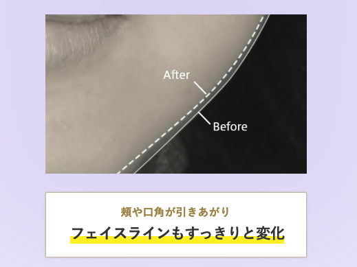 【試験方法】 ①洗顔後、使用前の顔を撮影。②マッサージをしながらサンプルを使用した後の顔を撮影。③使用前後の画像を重ね、フェイスラインの状態を確認。