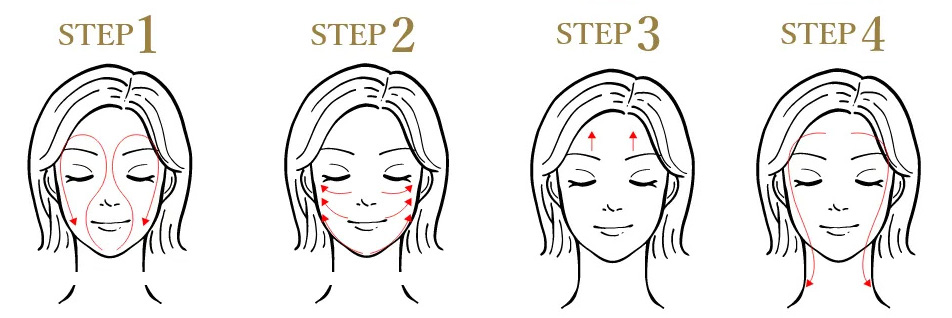 STEP2.フェイスライン、口、鼻の周りからこめかみに向けて、引き上げるようにマッサージする