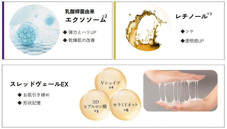 そしてVシェイプ※4・3Dヒアルロン酸※5・セラミドネット※6で構成された「スレッドヴェールEX」は、形状記憶の作用があり、肌を引き締めます。