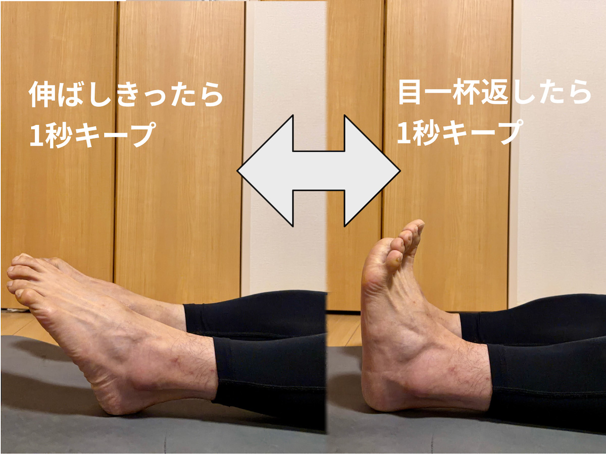 (2)つま先を目一杯伸ばしきったら、そのまま1秒間キープします。
