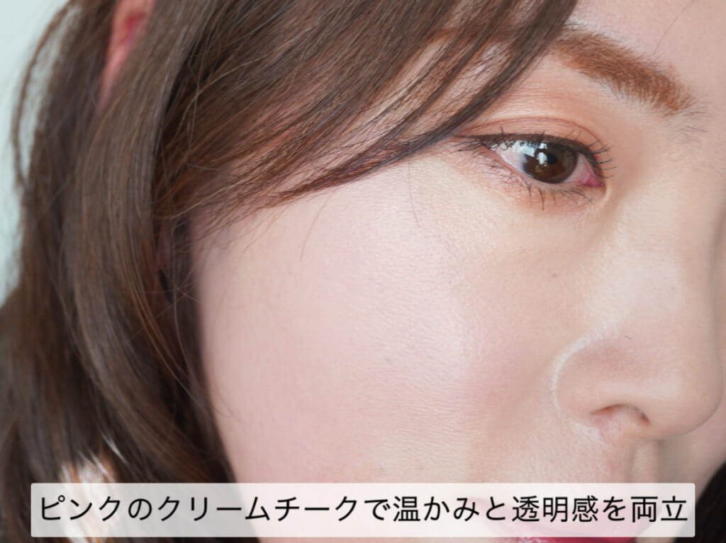 頬はピンク系のクリームチークで温もりと透明感をアップ