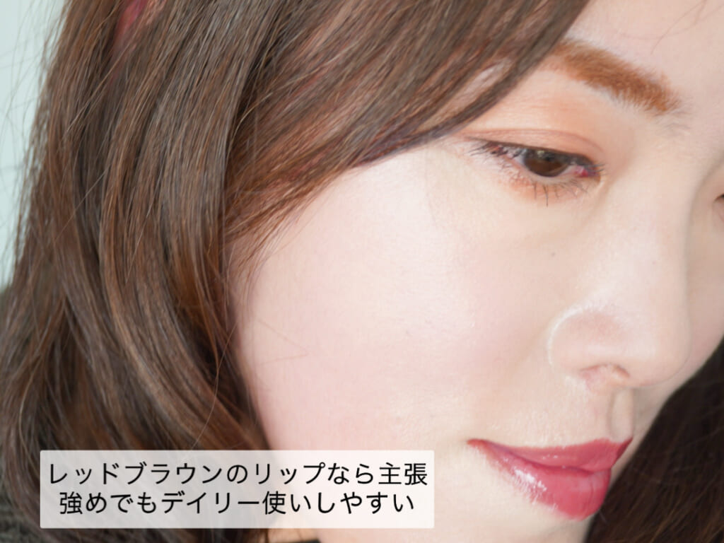 鮮やかなリップが苦手な方も、ブラウンがかったカラーなら落ち着きが生まれるため、デイリーシーンでも抵抗なく使いやすいですよ。