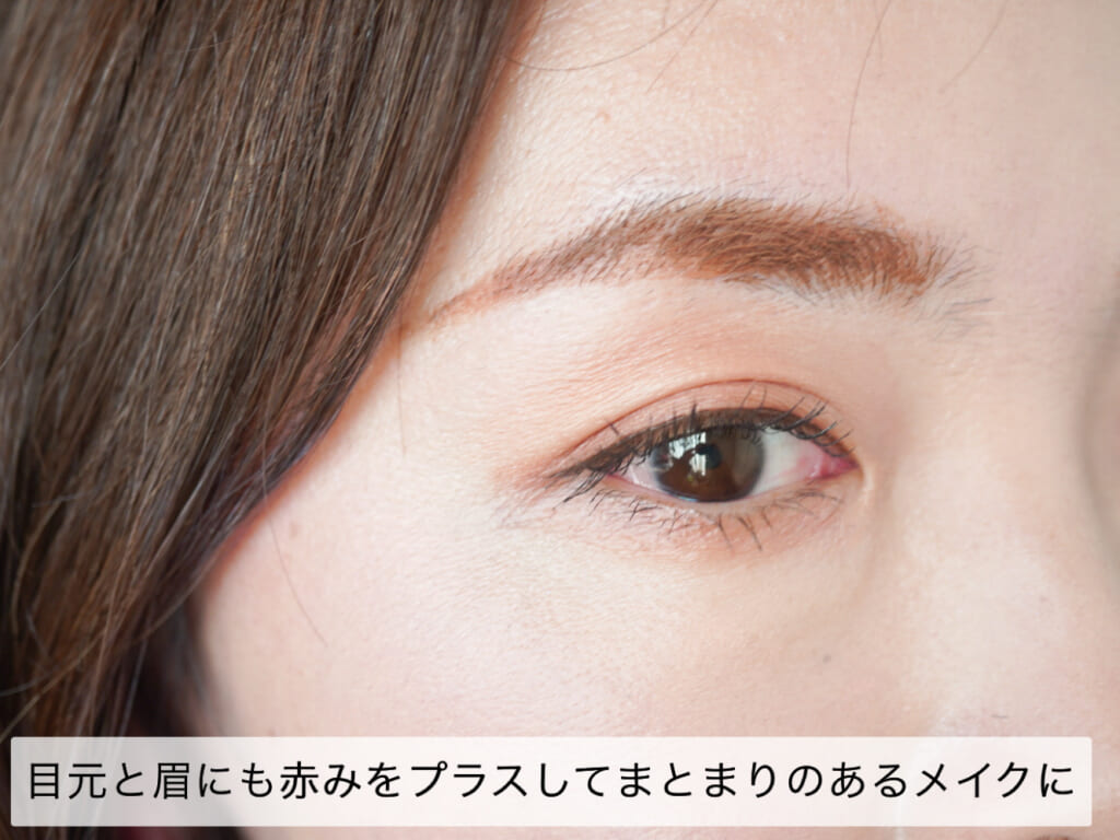 頬と口元に赤みを添えたら、目元も赤みがかった色を合わせると統一感が生まれます。血色メイクの王道といえる、赤みを帯びたベージュ〜ブラウン系のアイシャドウが便利です。