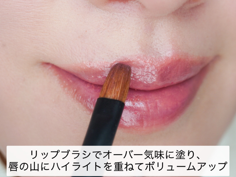 リップを塗るときは、リップブラシで輪郭の上を沿わせながらオーバー気味に塗ると、いつもよりボリュームアップ。さらに、唇の山にハイライトを重ねれば、よりふっくらとした印象になり、人中が短く見える効果も期待できます。
