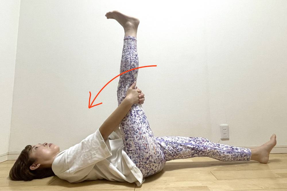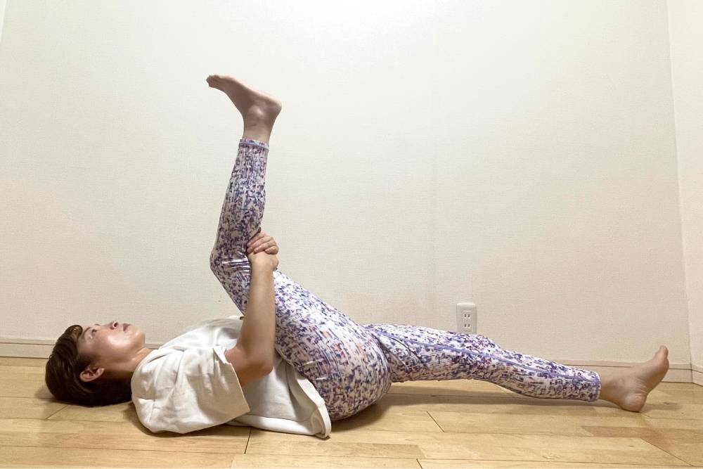 床に寝たら、片脚を天井に向かって持ち上げ、膝裏を両手で支えます。