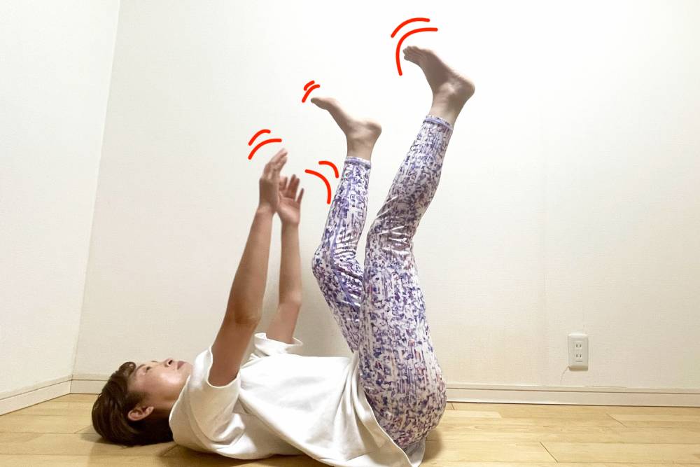 脚を天井に向かってまっすぐに上げるのがきつい方は、膝を曲げたままでも大丈夫です。