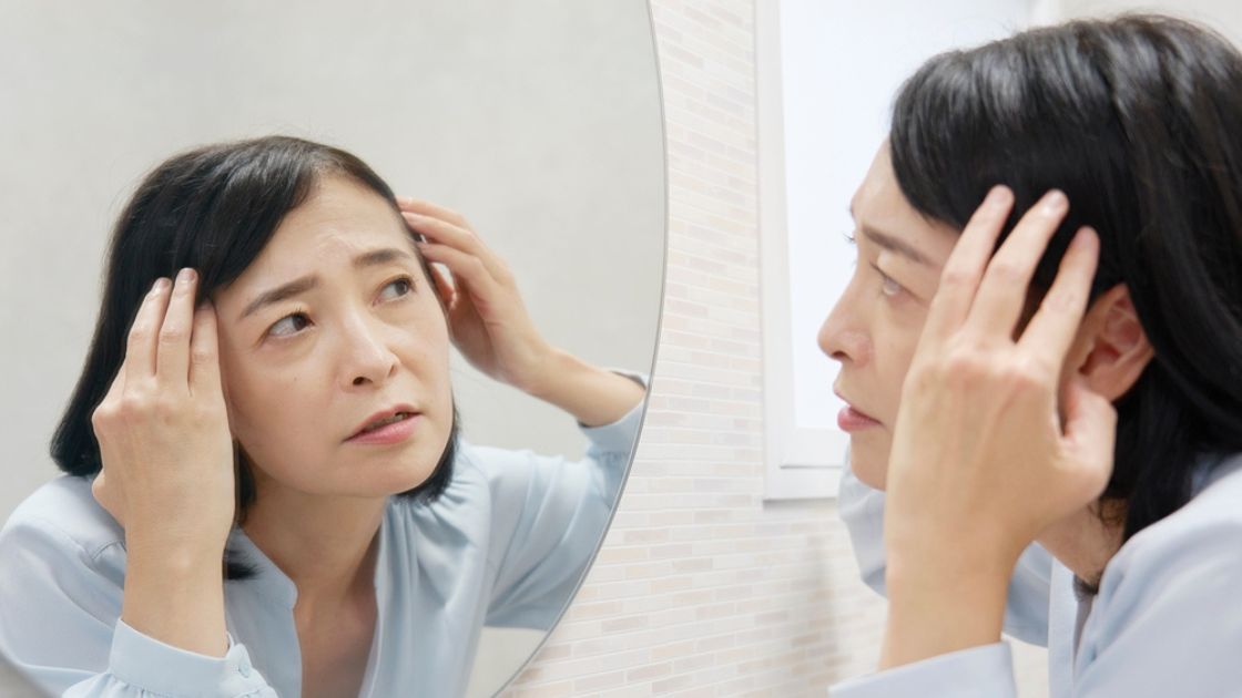 40代から50代は、更年期前後の影響で髪の印象が変わりやすい時期です。髪の成長を支えるバランスが揺らぐことで、ハリやコシが落ちたり、うねりが出たりして、同じ毛量でも地肌が透けて見えることがあります。