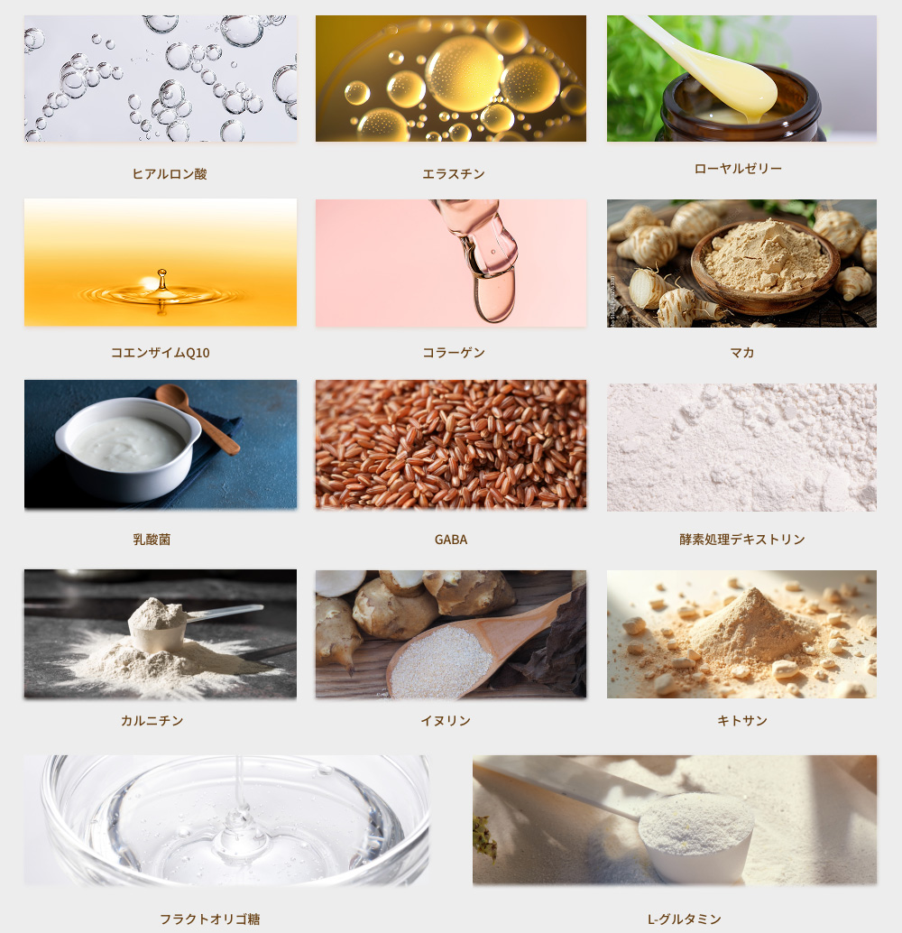 コラーゲンやエラスチン、ローヤルゼリー、コエンザイムQ10などに加え、新たにLグルタミンとフラクトオリゴ糖も配合されました。