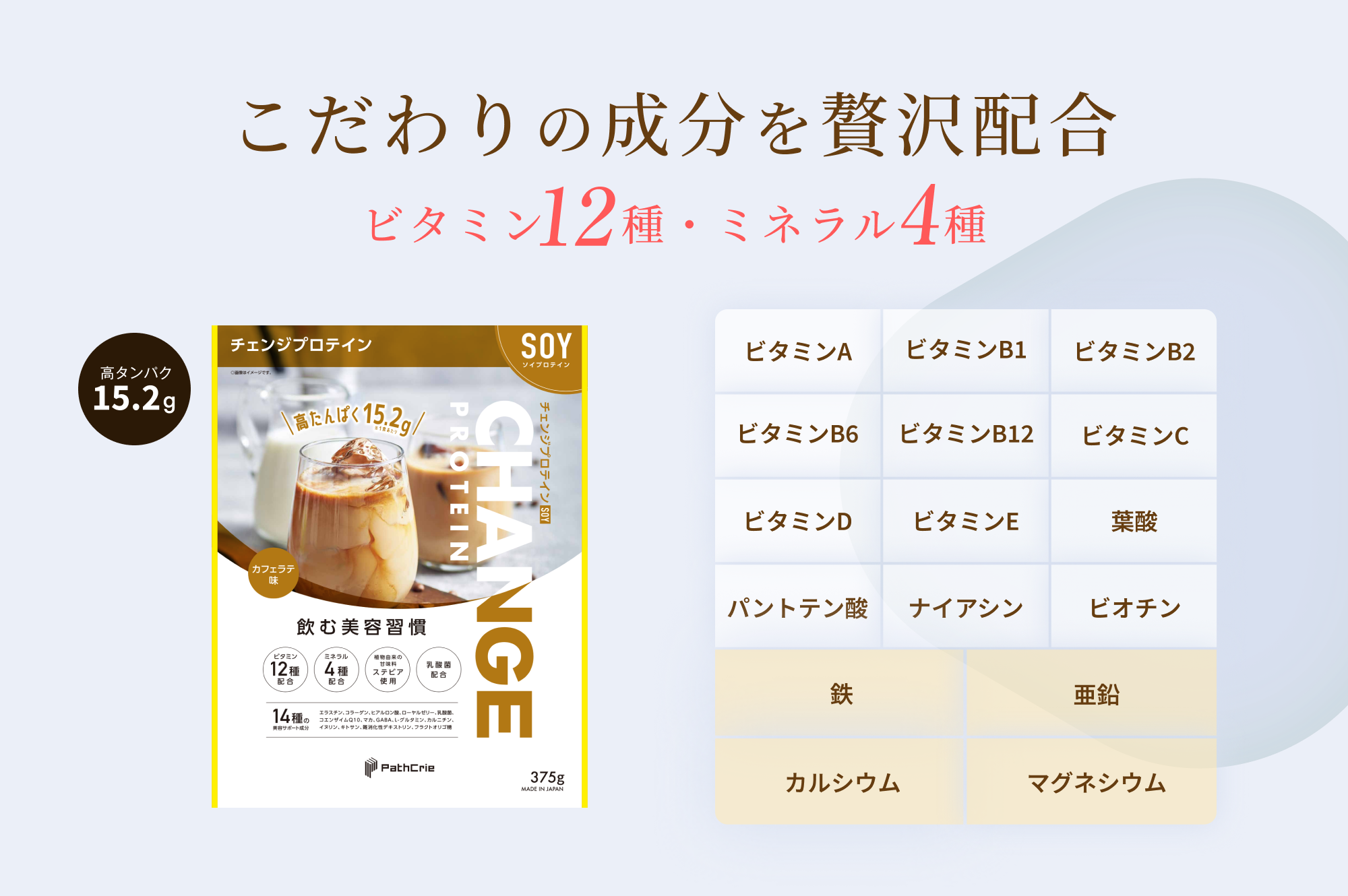 『チェンジプロテイン』にはビタミンAやビタミンB群、ビタミンCなどをはじめとするビタミン12種に加え、カルシウムやマグネシウム、亜鉛、鉄などのミネラル4種も配合されています。